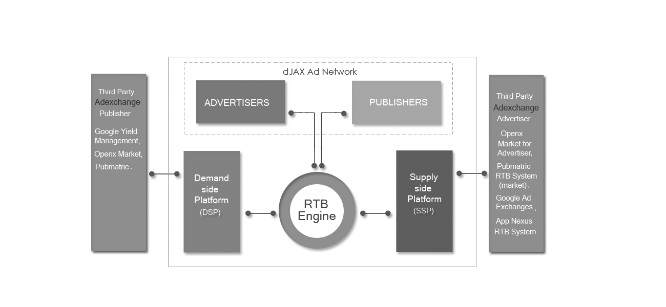 dJAX Exchange Framework provides a platform to integrate many third-party exchanges, buying and selling their real time inventory through real-time bidding, thus fetching real time revenue for Publishers and Advertisers. It allows the administrator to configure more than one third party ad exchanges like OpenX Market, Pubmatic, Google ads into dJAX ad exchange framework. This arrangement enables both getting inventory from other ad exchanges and sending ads to them.